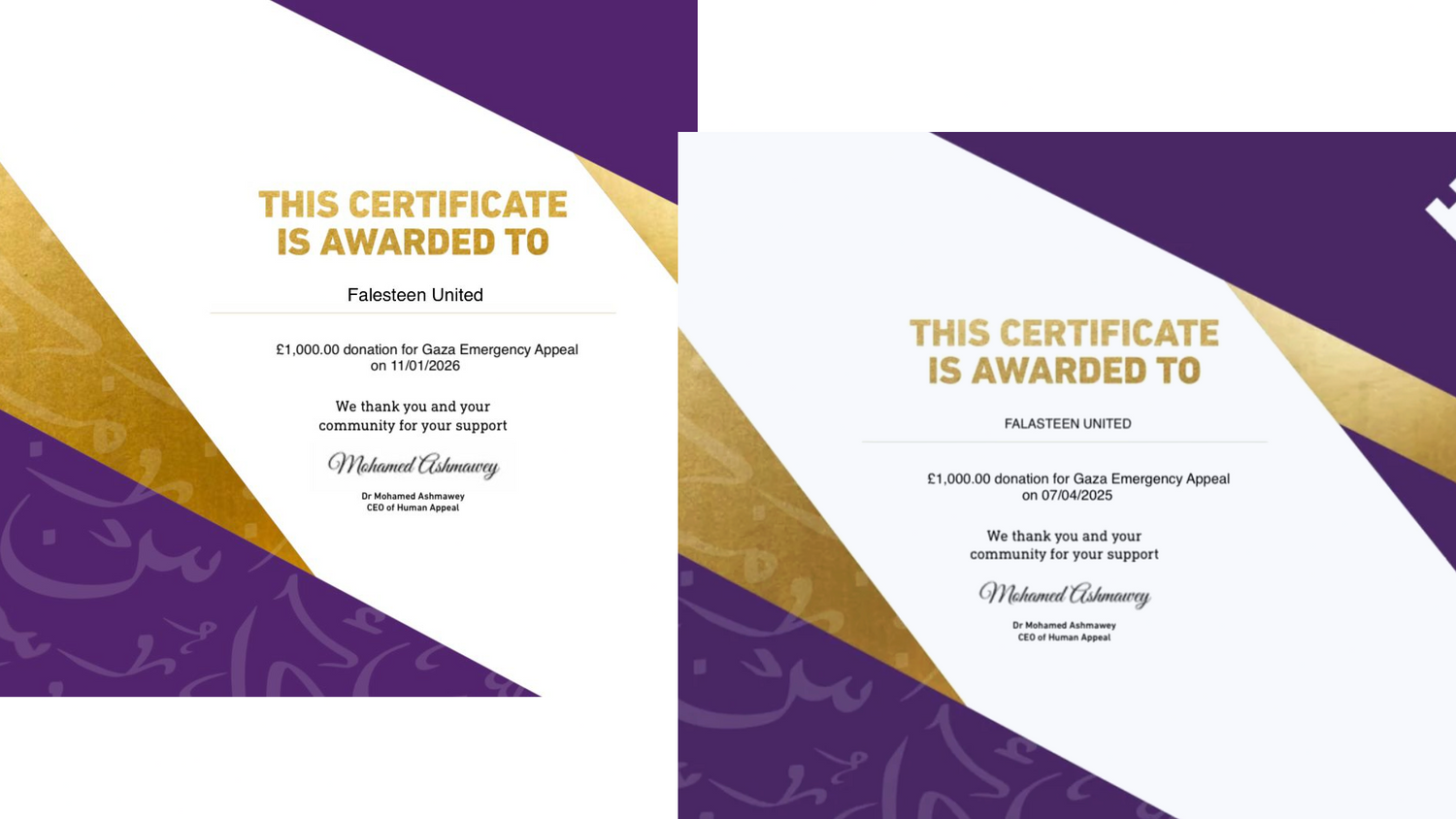 At Falasteen United, we believe in being as transparent as possible. That’s why we proudly display all our donation certificates from the charities we support.