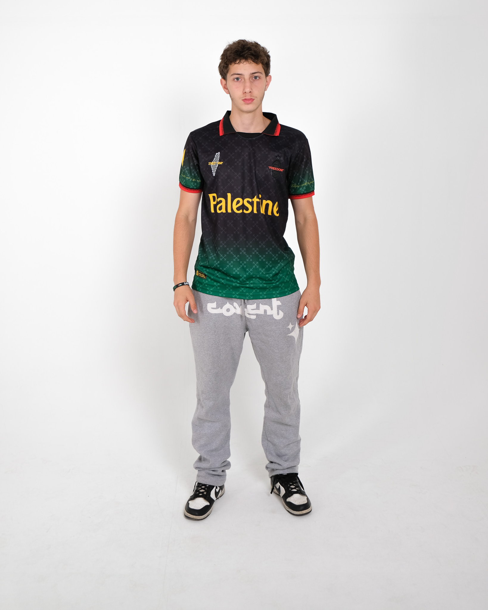 A black-to-green gradient design, featuring “Palestine” written across the front, and red-and-green trim on the sleeves and collar.