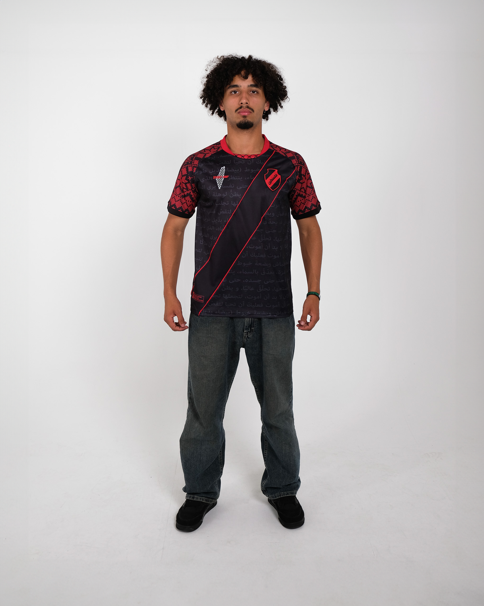 Make a powerful statement with our Red & Black Poem Football Jersey, honouring the words of Refaat Alareer. This unisex jersey features a bold red body with black detailing, including a striking tatreez pattern on the sleeves. The shirt is covered with the full text of “If I Must Die”