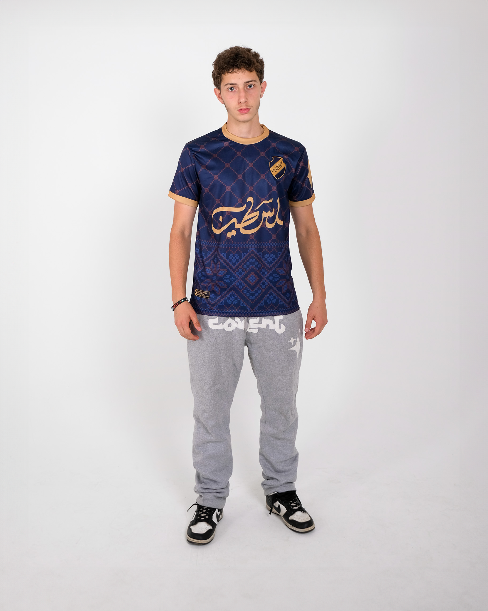 Celebrate Palestinian culture with our Navy & Gold Tatreez Football Jersey. This jersey features a bold navy base with an intricate tatreez pattern creating a fusion of tradition and sport.